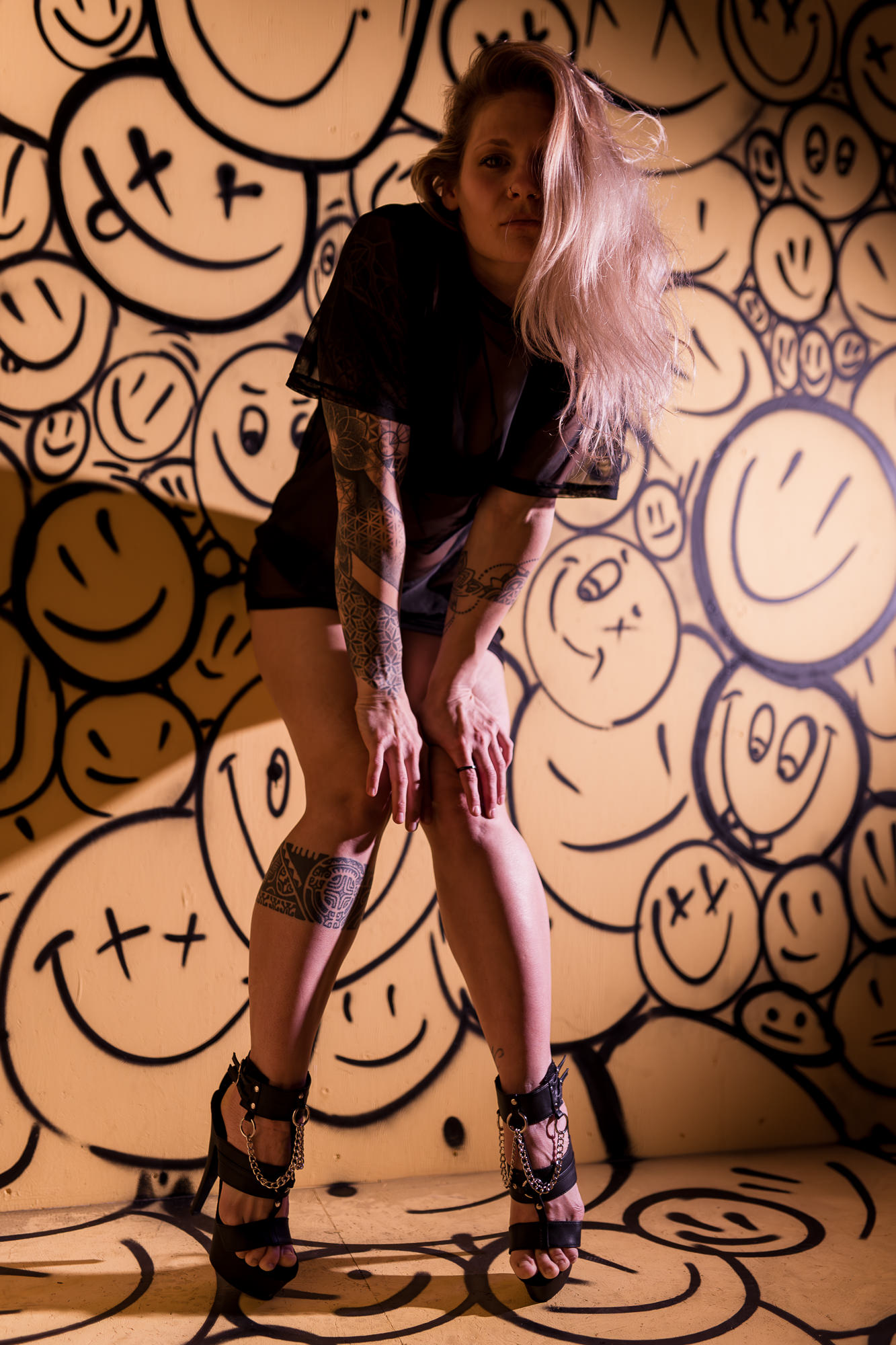 Gelb gestrichene Box mit großflächigen Graffiti-Smiley-Motiven
