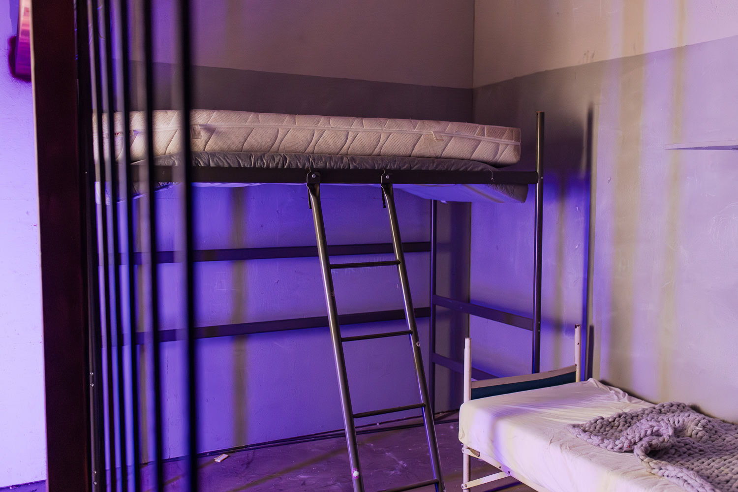 Zwei einfache Betten als bewusst rohe Set-Elemente