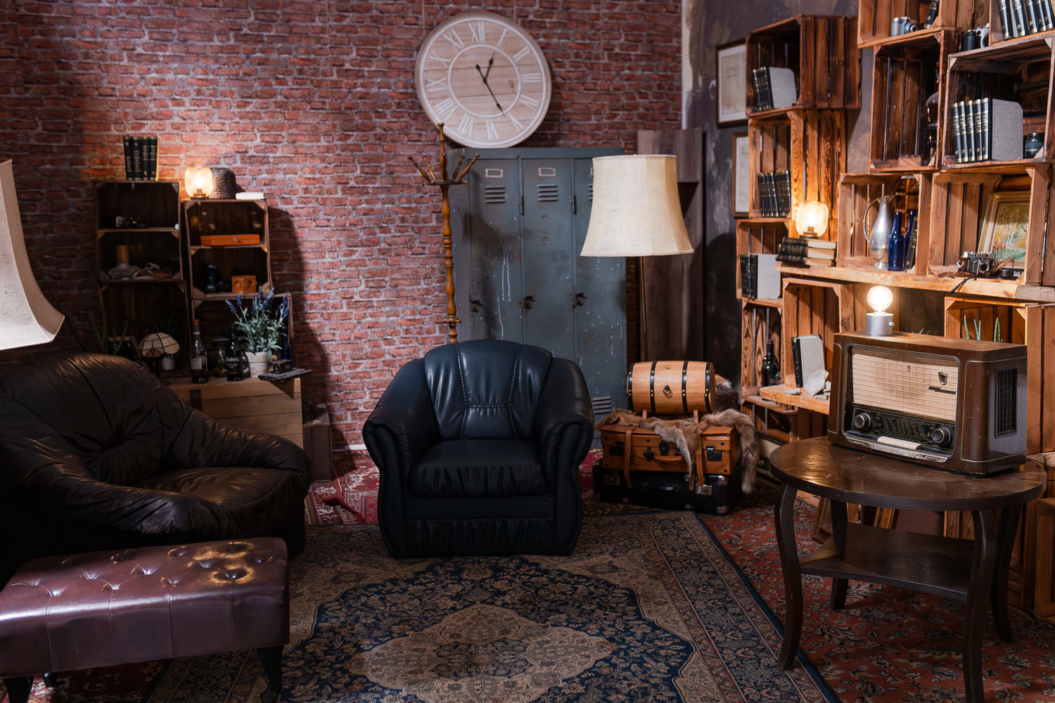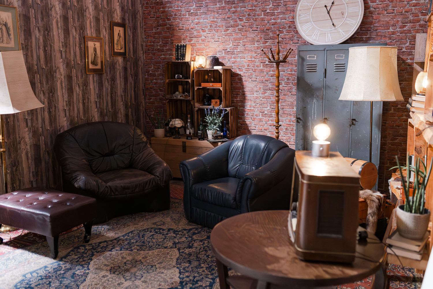 Alte Lampen, Holzboxen und ein Vintage-Radio setzen charaktervolle Details